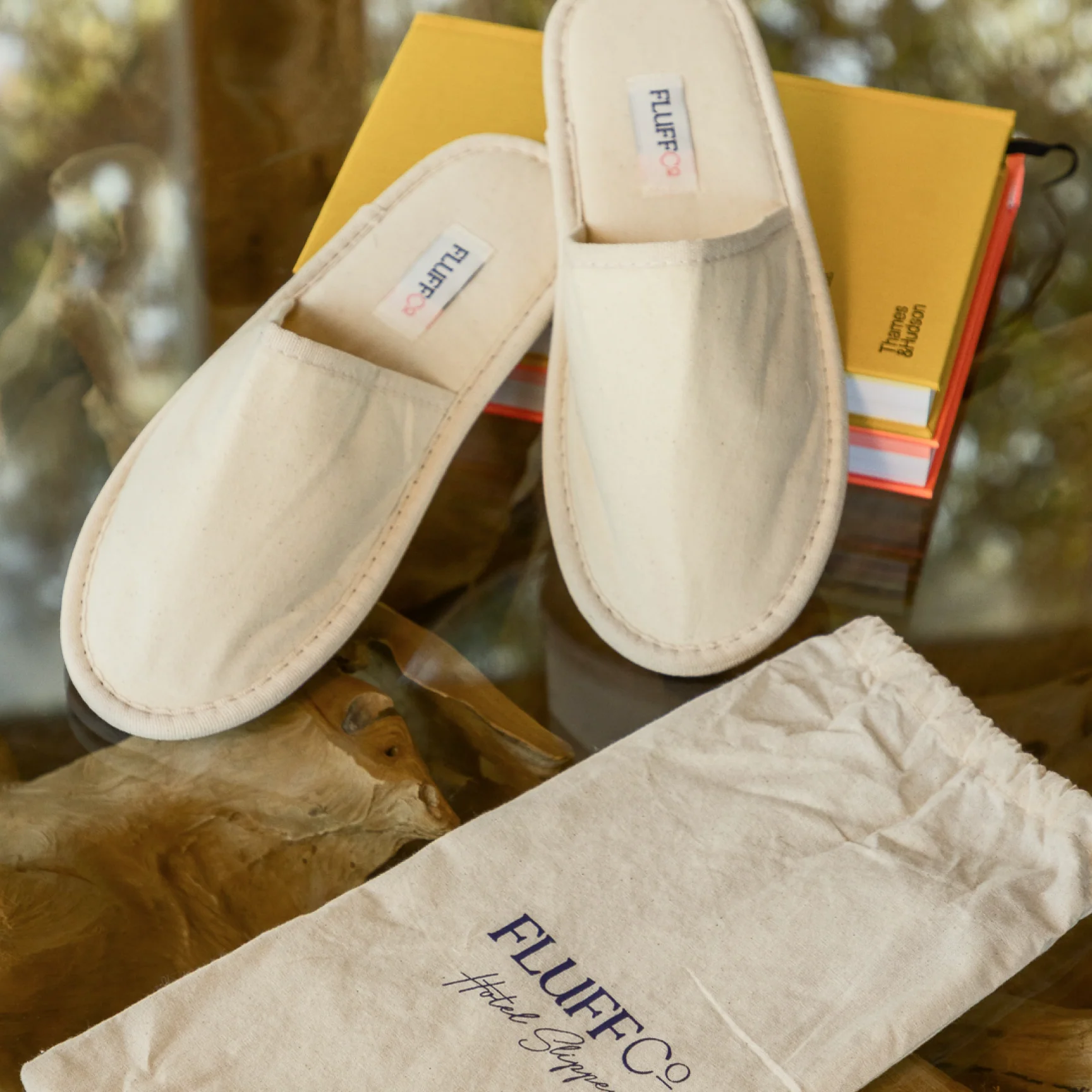 Indulge in everyday luxury with our Hotel Slippers, inspired by the comfort of high-end hotel amenities that make you feel at home in-room. These are designed for those who appreciate both style and sustainability, and are perfect for home or travel. Crafted from eco-friendly cotton with a stylish cork bottom, our slippers offer a plush and breathable experience, ensuring your feet stay cozy and comfortable.